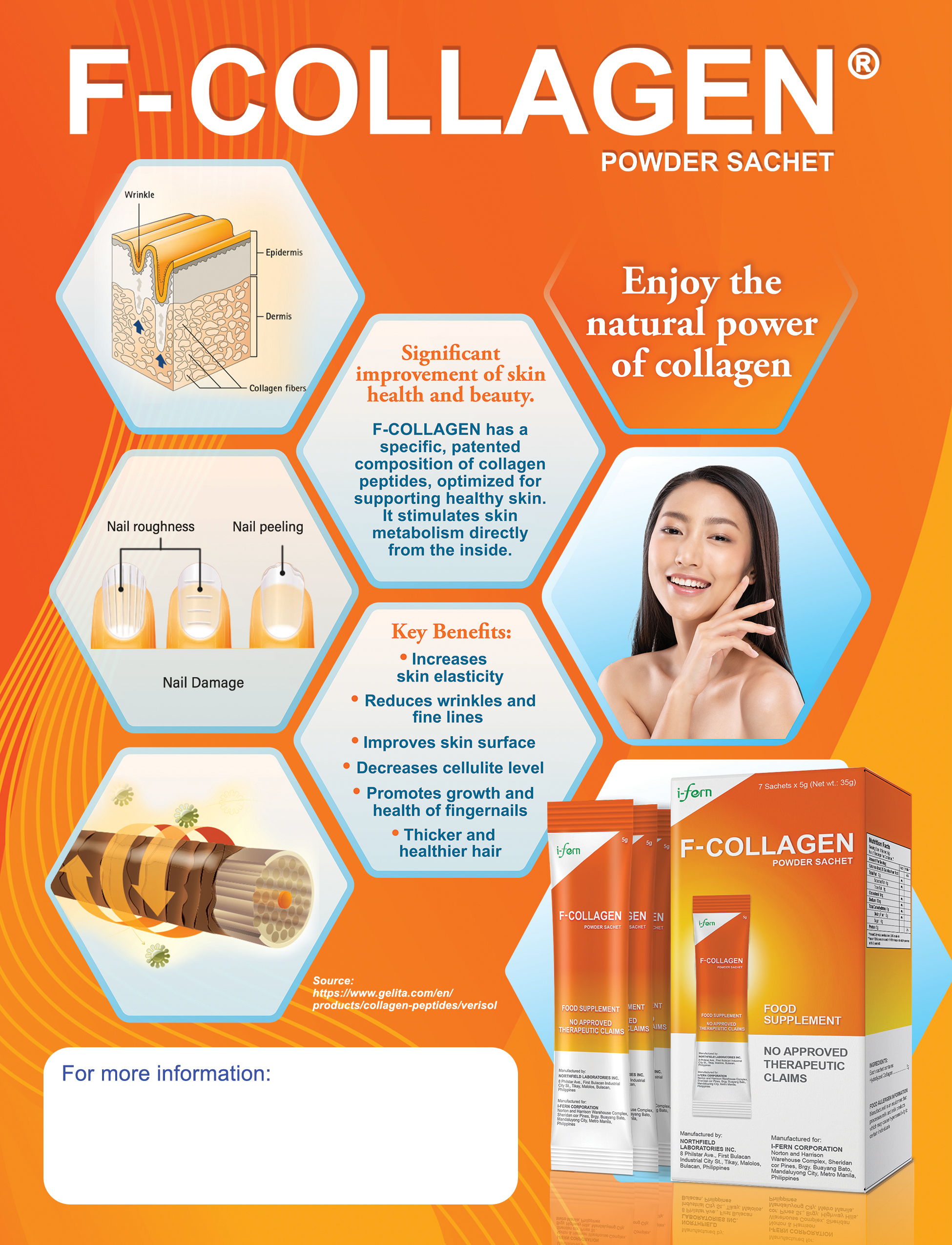 Unlock the natural power of collagen with F-Collagen Powder Sachet, a premium collagen peptide supplement designed to support healthy, youthful-looking skin from within. Formulated with a specific, optimized blend of collagen peptides, this advanced formula helps stimulate skin metabolism, improve elasticity, and reduce visible signs of aging. It works internally to promote smoother skin, stronger nails, and healthier hair, making it an ideal addition to your daily vitamins for adults routine.