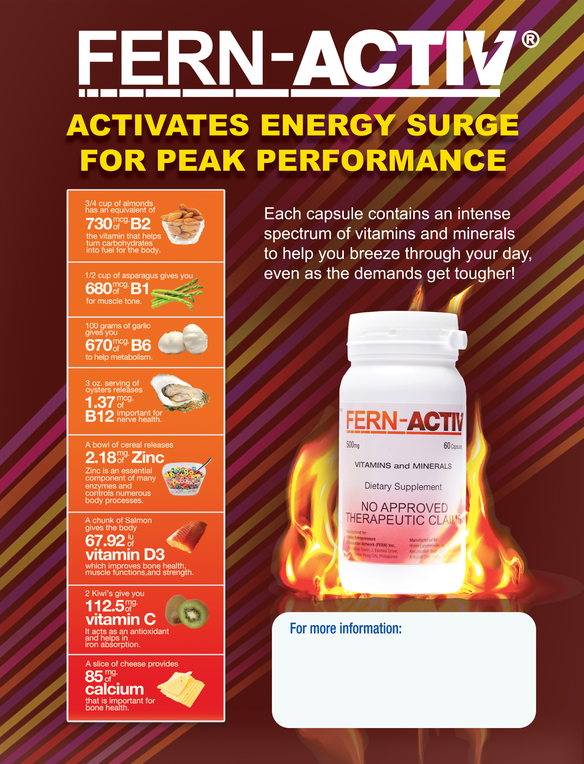 Formulated with Vitamin C for immunity, Zinc, and Vitamin D3, Fern-Active functions as reliable immune booster capsules. Zinc provides benefits similar to zinc tablets for immunity, while Calcium supports bone strength like calcium tablets for bones. With B-complex vitamins and essential minerals, it also contributes to vitamins for muscle strength, nerve health, and metabolism support. It is ideal as daily vitamins for adults, especially vitamins for office workers and individuals managing a busy lifestyle.